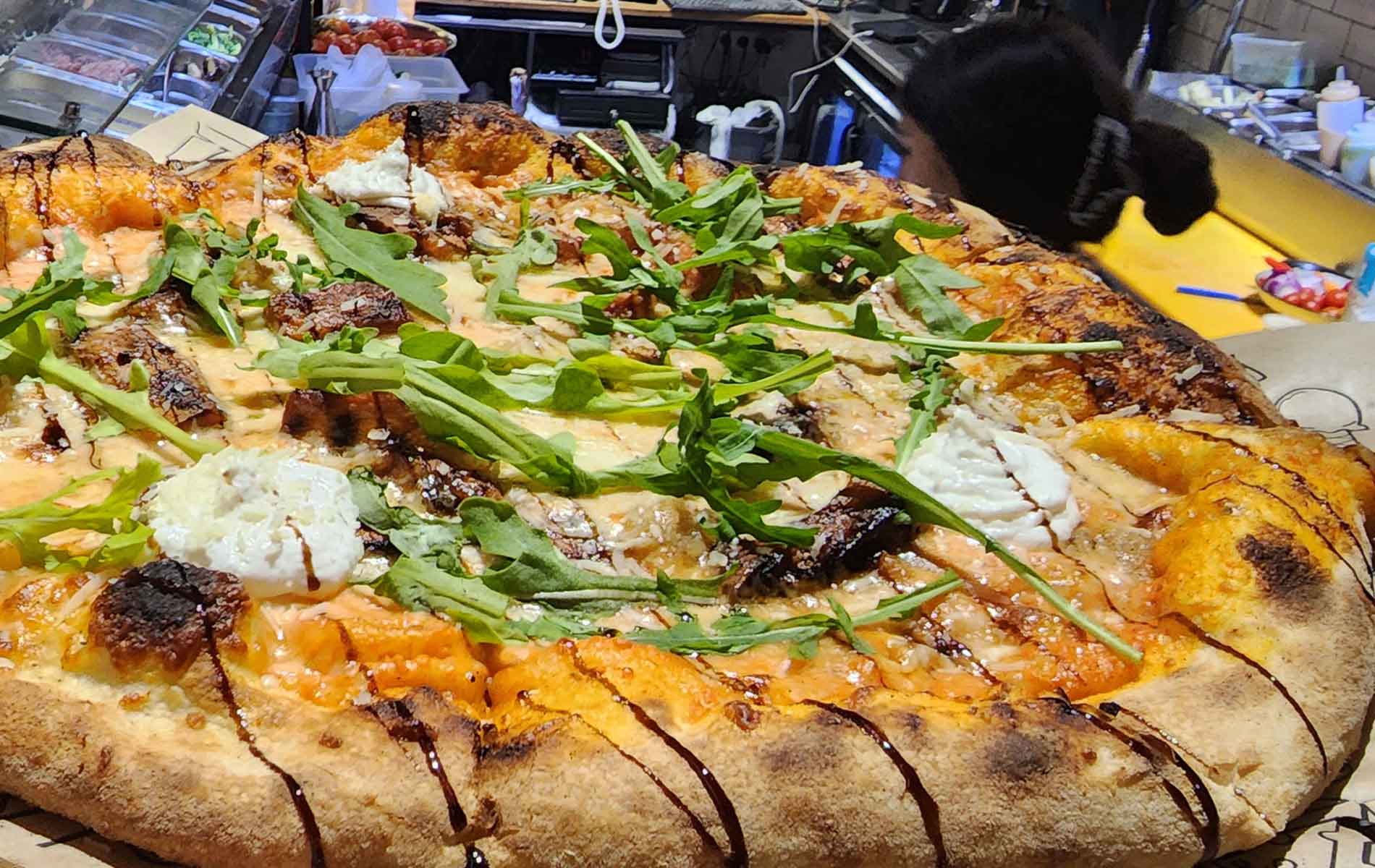 - 60/94 -רוטב שמנת, מוצרלה, בזיליקום, פפרוני, בצל סגול, נגיעות צ'ילי, קונפי שום ופרמז'ן